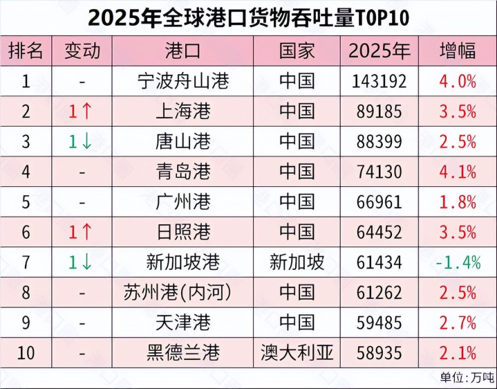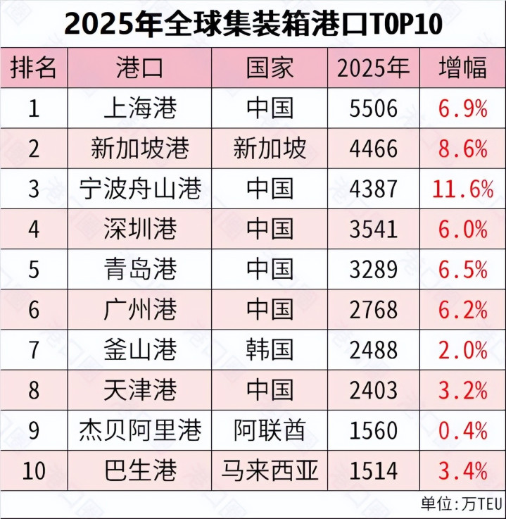 另一方面,中国的口岸范围与蒙眬量在全宇宙遥遥开端。2025年,全球前十大集装箱口岸永诀是,上海港、新加坡港、宁波舟山港、深圳港、青岛港、广州港、釜山港、天津港、杰贝阿里港、巴生港。前十个中国占6个。前6的口岸只好一个新加坡港排第二,其余齐是中国的。 从全球口岸货品蒙眬量来看,全宇宙前十个口岸中国占8个,名次前6的口岸齐是中国的。 不错说,全球的集装箱与货运量的半壁山河齐是中国撑起来的。任何一家航运巨头齐莫得认识离开或者绕过中国口岸,失去中国口岸,莫得哪个航运巨头能活下来。