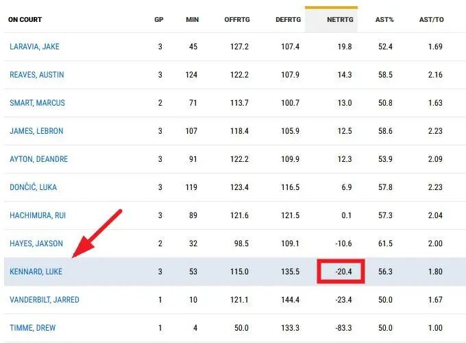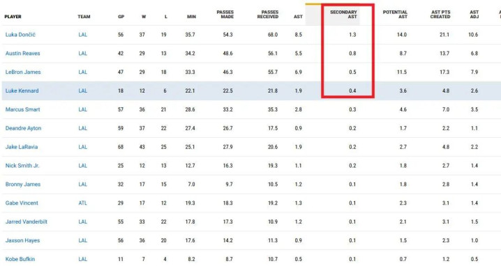 二、球场阅读力。 ——肯纳德。场均0.4次二次助攻。 ——克内克特。场均0.0次二次助攻。 二次助攻上,湖东谈主队内最高的是东契奇场均1.3次、然后是里夫斯的0.8次和詹姆斯的0.5次,再即是肯纳德了。
