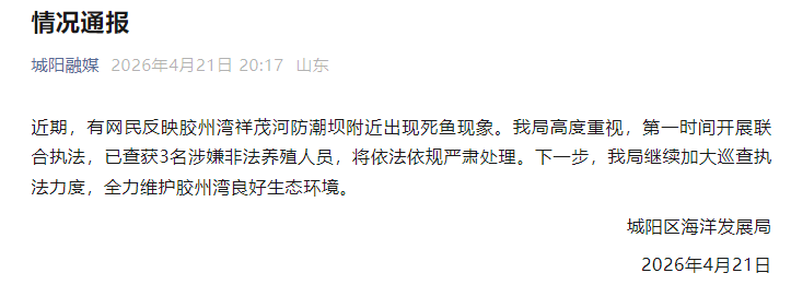 4月21日,青岛城阳区海洋发展局发布情况通报: 近期,有网民反应胶州湾祥茂河防潮坝近邻出现死鱼表象。我局高度酷爱,第一时刻开展连合公法,已查获3名涉嫌违纪滋生东...
