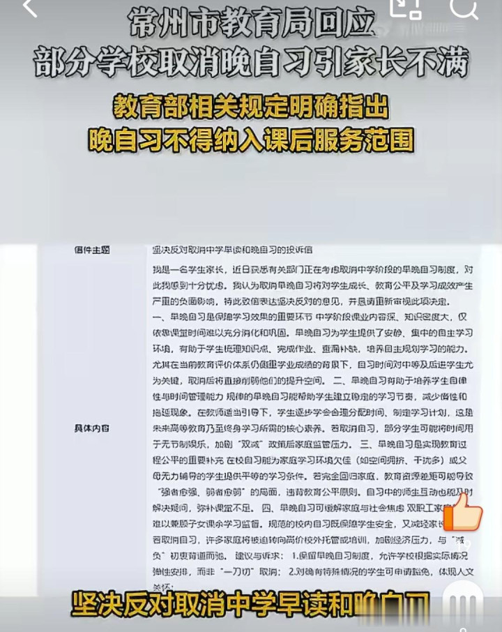 音问一出,家长群瞬息分红了两派,以致有东谈主成功把投诉信写进了市长信箱,言辞厉害地暗示“强项反对”。这到底是讲授部门的“一刀切”懒政,照旧家长们过度心焦下的“被动内卷”?今天,咱们就来聊聊这个闹得沸沸扬扬的“常州晚自习风云”。 家长急了:没了晚自习,孩子的出息在那处? 事情的启事并不复杂。近日,有网友发帖称,常州部分初中运转“动真格”,取消了月朔初二走读生的晚自习安排。按理说,孩子能早点回家,毋庸在教室里熬到八九点,这难谈不是善事吗? 但对于特地一部分家长来说,这纸见知无异于“好天轰隆”。 在事情发酵前,其实就依然有家长急不行耐,在市长信箱里留住了长篇留言。这位家长的不雅点,不错说代表了大渊博“反对派”的心声。他/她以为,旦夕自习不单是是多上一节课那么浅易,而是保险学习着力的“压舱石”。