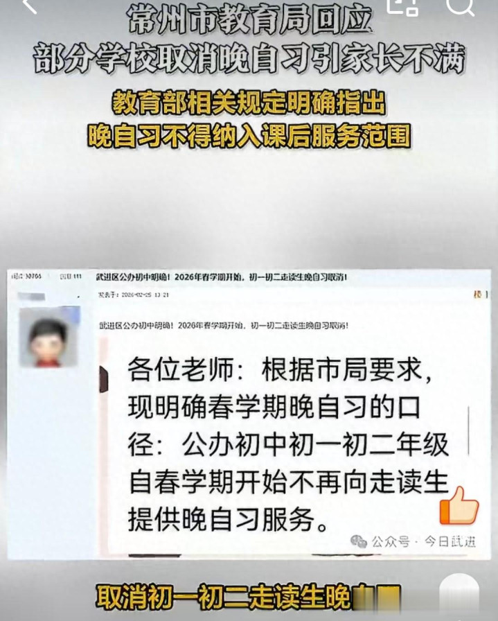 最近,江苏常州的讲授圈炸了锅。 不是因为高考状元,也不是因为学校出了什么极新事,而是因为一个看似浅易却戳中无数家庭神经的决定——取消月朔、初二年纪走读生的晚自习。