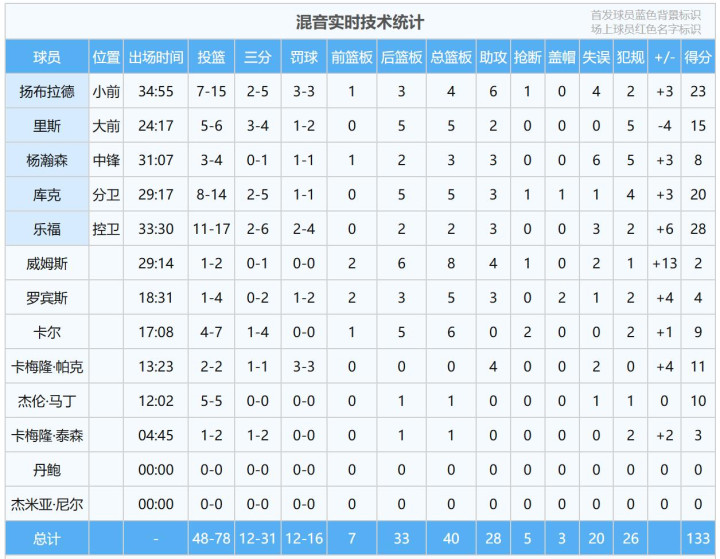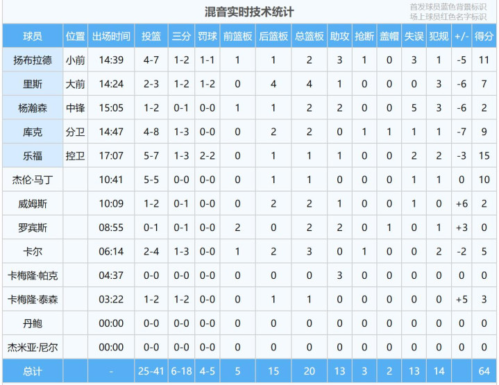 半场比赛数据,混音队3东说念主得分上双,开云体育app其中乐福15分1板1助、扬布拉德11分2板3助、杰伦·马丁10分1板、库克9分、里斯7分、卡尔5分、卡梅隆·泰森3分、杨瀚森2分。