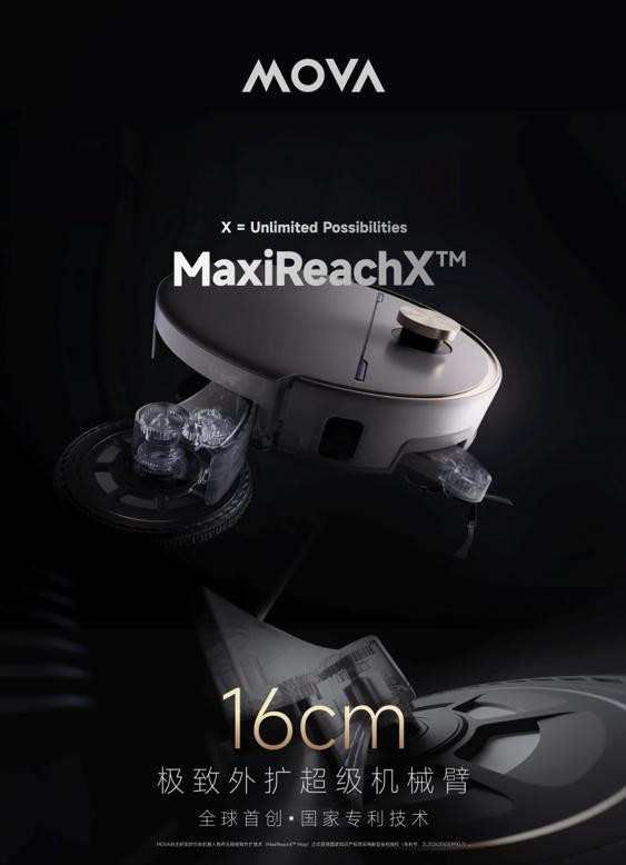 近日,群众高端翻新智能家电品牌MOVA自主研发的扫地机器东谈主拖布微辞极致外扩期间(MaxiReachX™ Mop)认真得回国度常识产权局实用新式专利授权(专利号:ZL202620000990.7)。该期间以群众首创的16cm极致外扩超等机械臂为中枢,初度在扫地机器东谈主范畴修复了可脱离机身适度进行大地清洁的期间旅途,使扫地机器东谈主的清洁神气从“机身参加空间”转向“清洁结构主动蔓延参加空间”,让清洁单位不再受限于整机尺寸。
