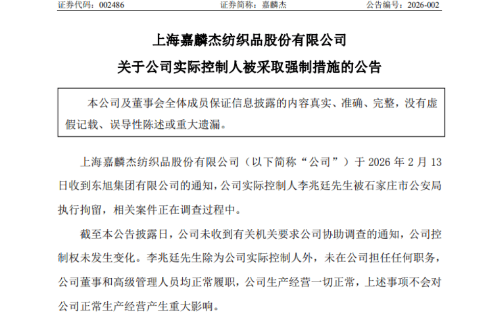 开端:凤凰网财经《公司商榷院》 原标题:又一册钱大佬栽了,2000亿本钱帝国通宵垮塌 也曾的石家庄首富、“东旭系”掌门东说念主李兆廷,再次出当今聚光灯下。 2月13日晚间,上市公司嘉麟杰公告称:公司本色戒指东说念主李兆廷被石家庄市公安局奉行拘留,关联案件正在看望经由中。 嘉麟杰在公告中戮力于抛清干系,称李兆廷除为公司本色戒指东说念主外,未在公司担任任何职务,坐褥盘算推算一切浮浅。2月14日,嘉麟杰报3.16元/股,市值26.05亿元。看成“东旭系”鲁殿灵光的上市公司,嘉麟杰能否真是独善其身,仍是未知数。