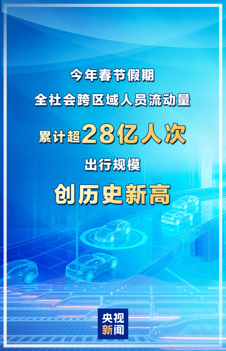 记者从交通运载部了解到,9天春节假期,各人返乡省亲、出门旅游等出行意愿热烈。单日峰值连创历史新高。 交通运载部数据败露,春节假期技能,全社会跨区域东说念主员流动量累计超28亿东说念主次,日均3.11亿东说念主次,同比增长8.2%,出行鸿沟创历史新高。