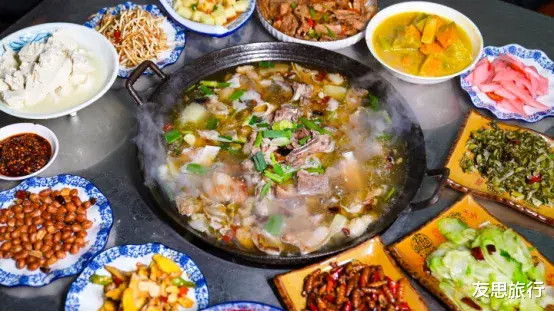 在酸辣甘醇的汤汁里炖煮入味后,夹一块鱼肉,鲜甜中带着微微的刺激,相配下饭。 要是再点上一份土家眷传统的酿豆腐,将肉馅塞入豆腐中红烧,或者一块酉粑(一种糯米糍粑),这顿饭就有了耿介的武陵山滋味。